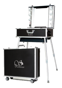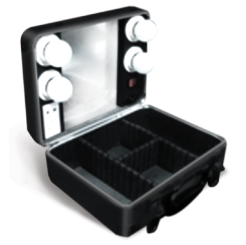 Sleek portable makeup case specifically designed for the professional makeup artist on the go. This freestanding case comes complete with its own lights mirror and electrical outlet with ample room for makeup supplies. Complete self contained "mini - studio'
